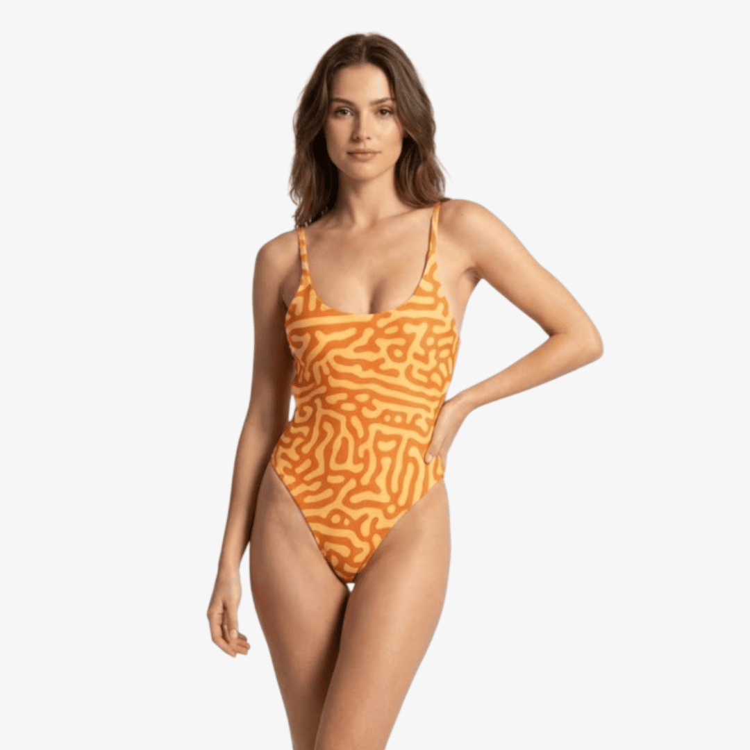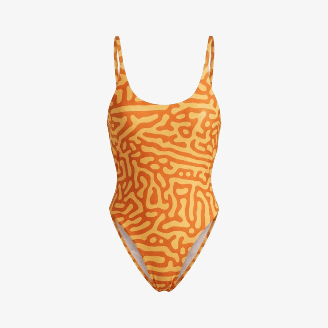 The CAPRI one-piece swimsuit is bold, vibrant, and full of personality. With its abstract orange and yellow print, it blends vintage flair with contemporary energy — perfect for confident women who love to stand out.