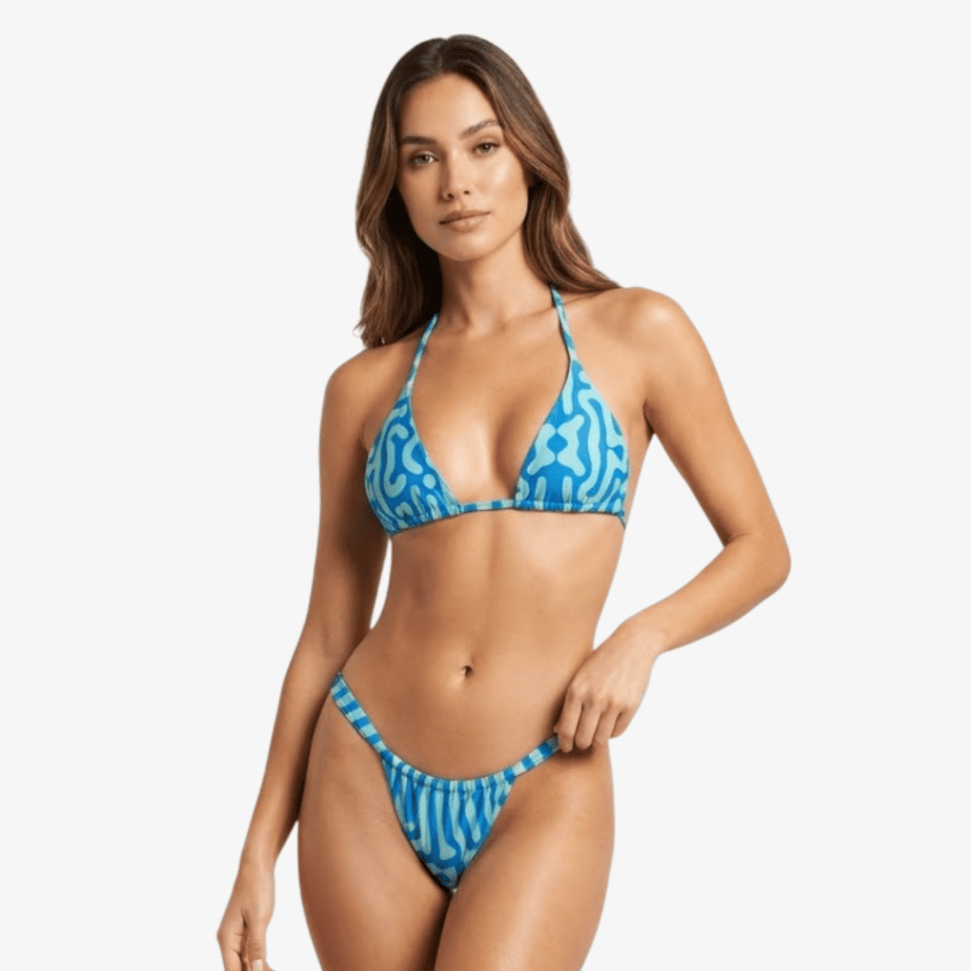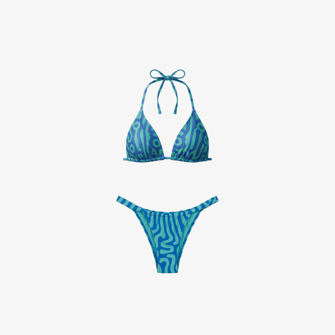 The CURAZAO bikini bursts with vibrant color and energy — perfect for bold summer lovers. Its electric blue and lime green wavy print makes it a standout piece for beach days or poolside lounging.