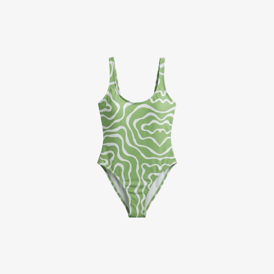 The FIJI one-piece is inspired by the lush, serene beauty of tropical islands. Its organic mint green and white print creates a sense of calm and freshness — perfect for those who love a modern look with a natural touch.