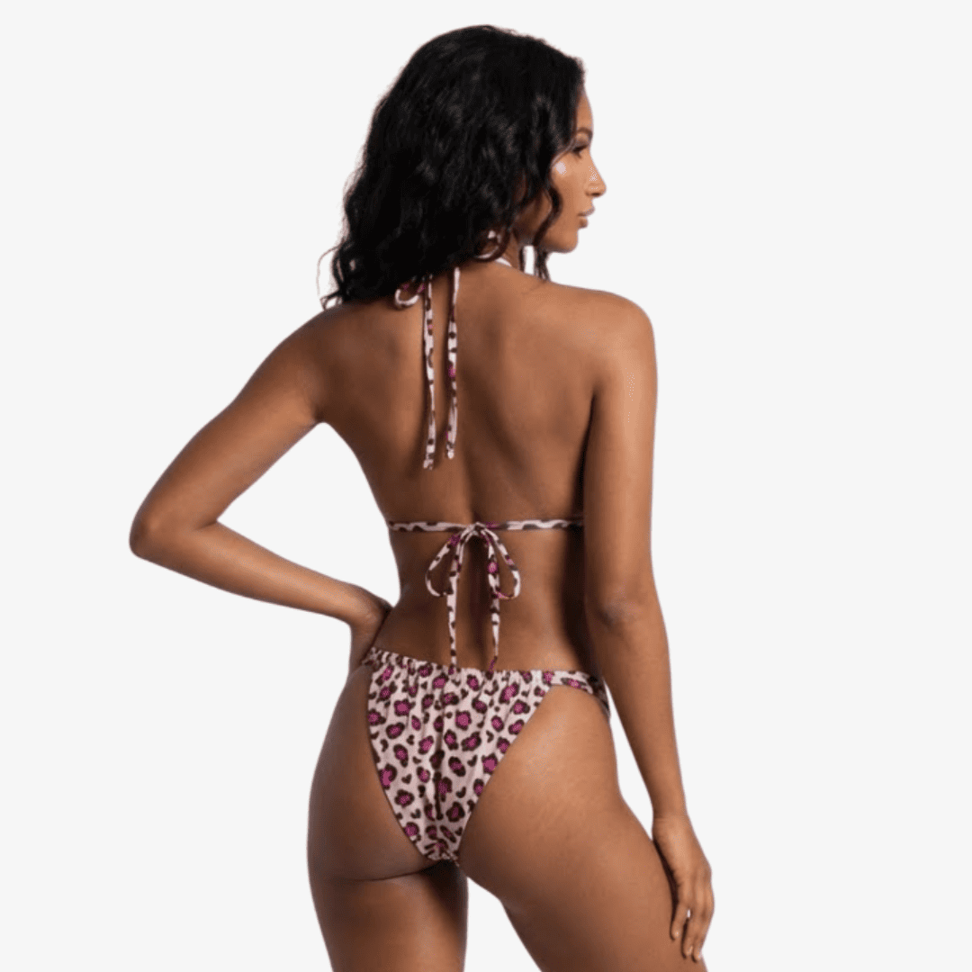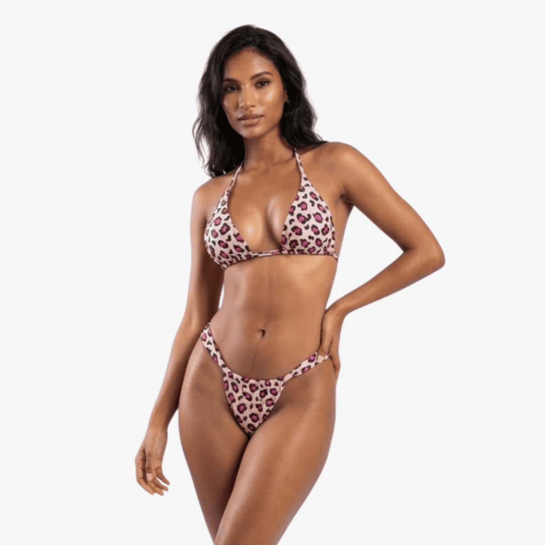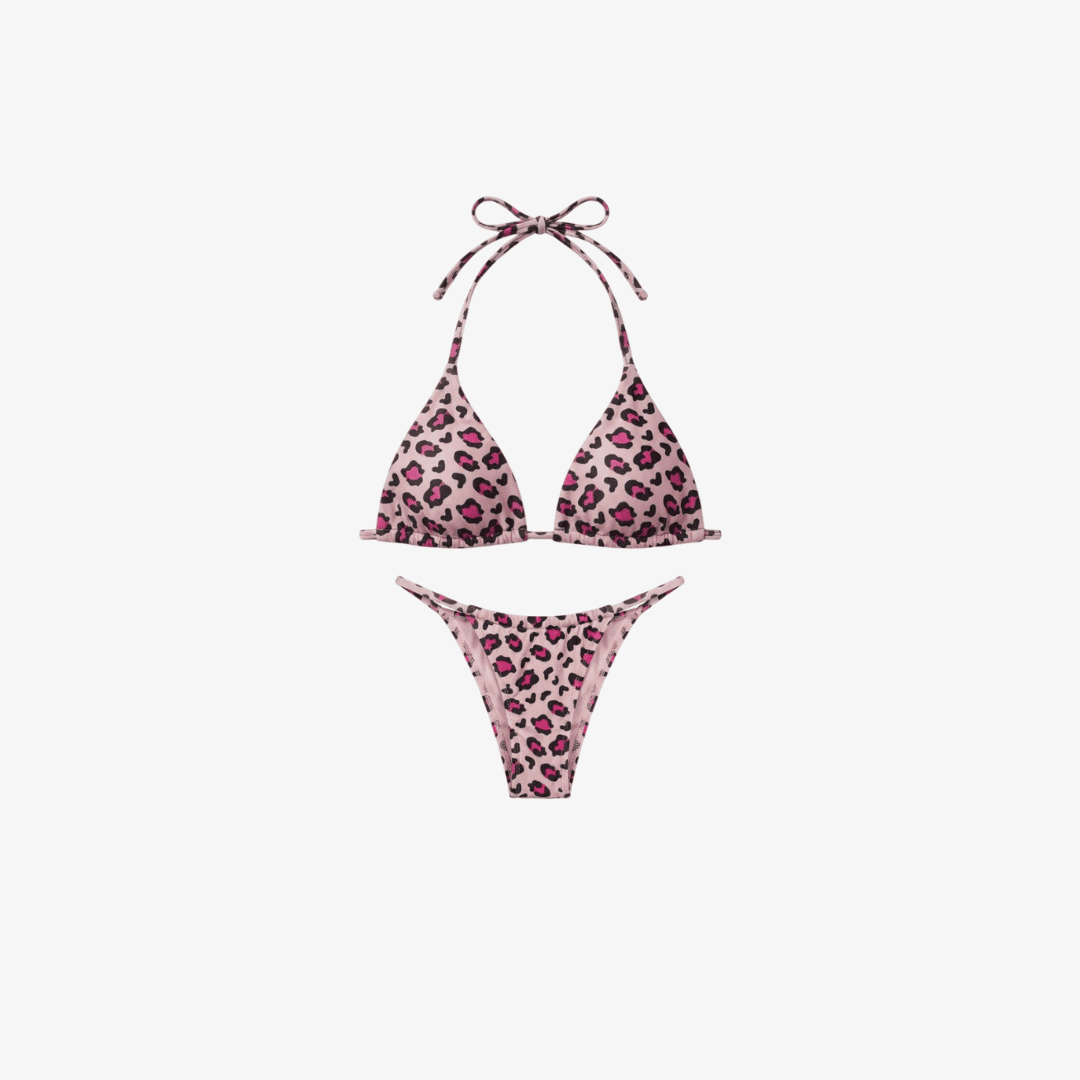 The MYKONOS bikini blends bold leopard vibes with feminine flair. Featuring a pink, fuchsia, and black leopard print on a light background, it’s made to turn heads—whether you’re lounging poolside or dancing at a beach club.