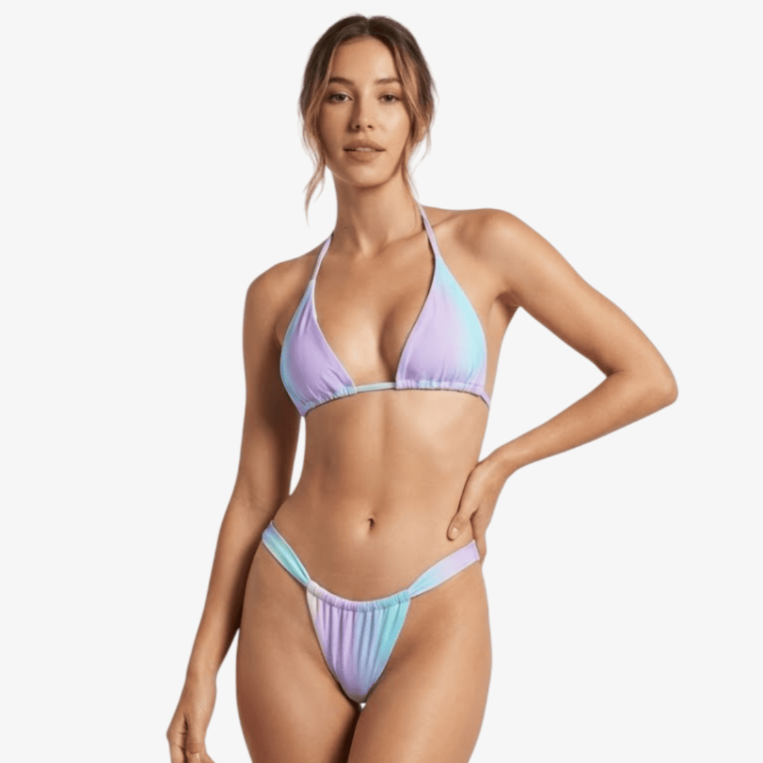 The PHUKET bikini blends softness with bold summer energy. Its pastel gradient in shades of lilac, aqua, and blush pink mirrors a peaceful tropical sunset. A dreamy choice for effortless poolside elegance.